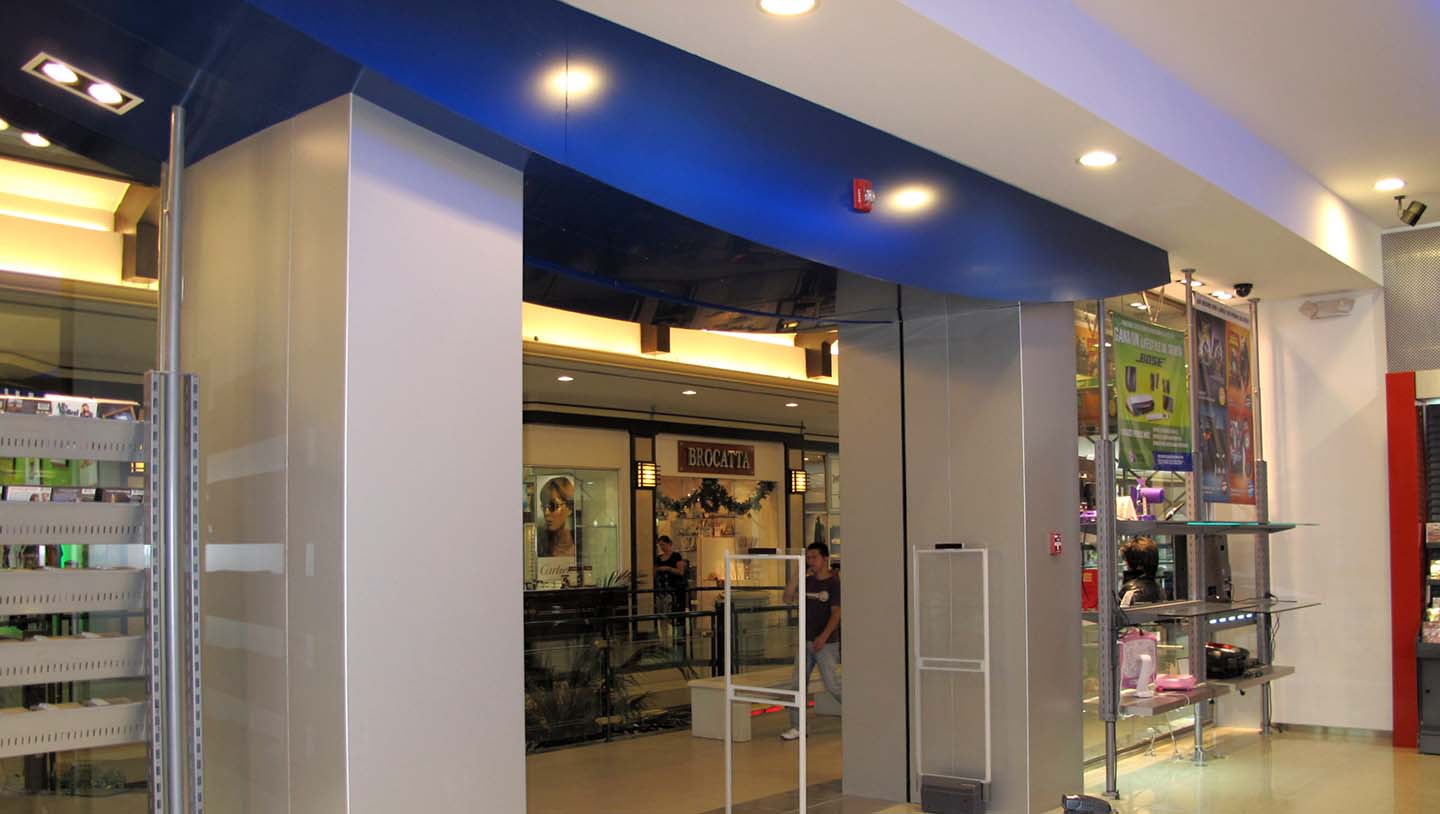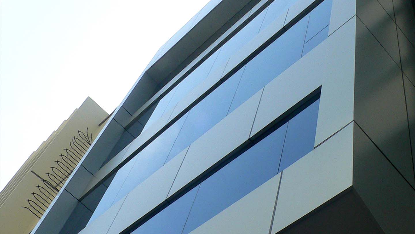 Aluminum Composite panels are ideal for coating columns, walls, and ceilings; advertising signage; showrooms; and space divisions. The aluminum composite panel coating is composed of two aluminum sheets separated by a thermoplastic that serves as thermal, acoustic, and fire insulation.